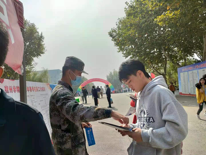 活动现场循环播放征兵宣传片,发放大学生应征入伍条件政策宣传彩页,数百名学生现场咨询并积极加入2022年春季征兵工作群。工作人员向前来咨询的学生详细解读大学生参军入伍应征条件、应征流程、优待政策、发展途径以及经济补助等问题,号召同学们携笔从戎,到军营中提升自我、报效国家,书写绚烂无悔的青春篇章。