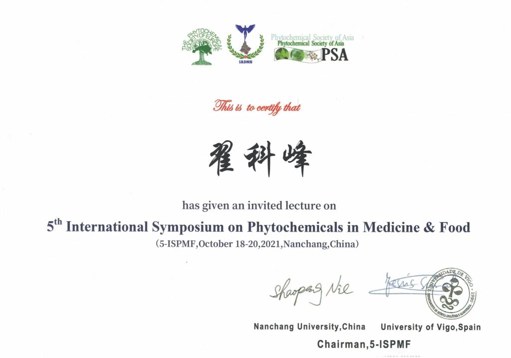 2021年10月18日-20日,由国际食物营养与安全协会、欧洲植物化学会和亚洲植物化学会共同主办,南昌大学和西班牙维戈大学共同承办的第五届医药与食品中的植物化学物质国际会议(5-ISPMF)在南昌召开。大会采取了线上直播和线下学术报告相结合的方式进行,线上会议从2021年8月25日-9月1日,线下会议10月18-20日在南昌举行,正式会议共10天。生物与食品工程学院翟科峰教授应邀参加会议,并邀请作题为“Liquiritin from Glycyrrhiza uralensis attenuating Rheumatoid arthritis via reducing inflammation, suppressing angiogenesis, and inhibiting MAPK signaling pathway”的学术报告。