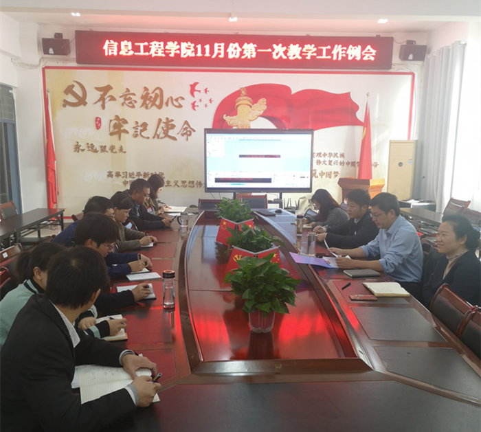 11月3日下午,信息工程学院在工B315会议室召开11月份第一次教学工作例会,信息工程学院党委副书记、院长许海峰,党委副书记、纪委书记吴孝银,副院长崔琳、潘正高,党政办主任,教学、科研秘书,实习实训中心主任,教学委员会、学术委员会、教学督导委员会、各教研室主任等参加会议,会议由许海峰主持。