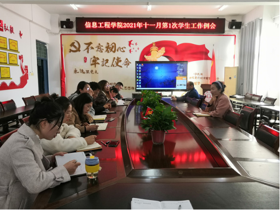2021年11月8日下午,信息工程学院在工B315会议室召开十一月第一次学生工作例会。会议由信息工程学院党委副书记、纪委书记吴孝银主持,信息工程学院组织员黄永刚(副处级)以及全体辅导员(班主任)参加了会议。