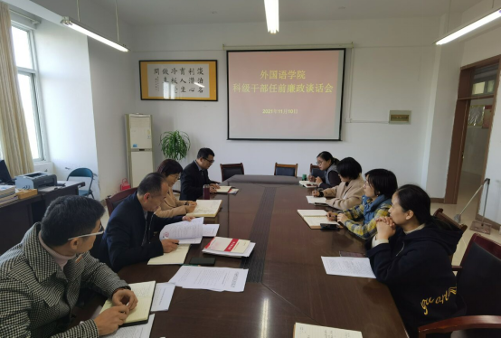 11月10日,外国语学院召开科级干部任职暨任前集体廉政谈话会。院领导班子成员、全体科级干部参加会议,党委副书记(临时负责)郝景东主持并讲话。