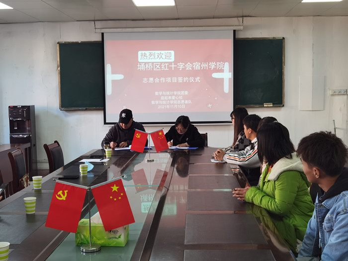 郑旭首先对埇桥区红十字会的成立、建设、发展及近几年开展的品牌志愿服务项目情况进行了介绍,让同学们了解红十字会是以服务站为基地,以红十字会员和志愿者为主体,以社区居民特别是弱势群体为服务对象,全面开展各种扶贫济困工作的国际性公益组织。接着郑旭对即将要合作的“一家衣善”公益项目提出了合作要求,对成立宿州学院数统学院红十字会志愿者分队给出指导意见。陈攀峰表达了对于学院成立红十字会志愿者分队的期望与信心,鼓励志愿者积极践行社会主义核心价值观,大力弘扬奉献、友爱、互助、进步的志愿精神,深入推动学院新时代文明实践志愿服务工作的常态化、品牌化发展。最后,刘静代表学院与埇桥区红十字会签订了青年志愿服务合作协议。