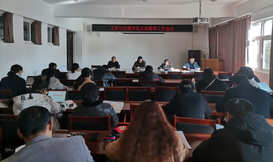 11月10日下午,文学与传媒学院在教A303召开全体教师工作会议,党委书记杨文艺,党委副书记、院长张德岁,党委副书记、纪委书记刘影,副院长李娟,副院长满建及全体教师参会。会议由张德岁主持。