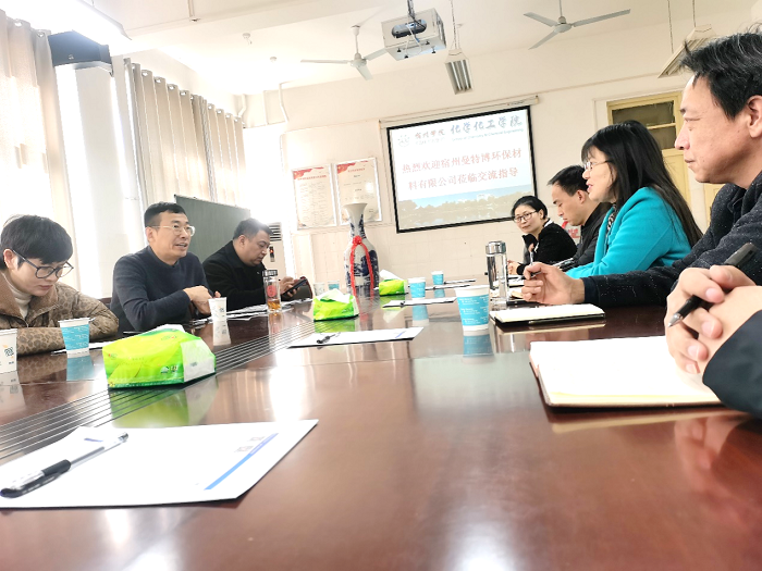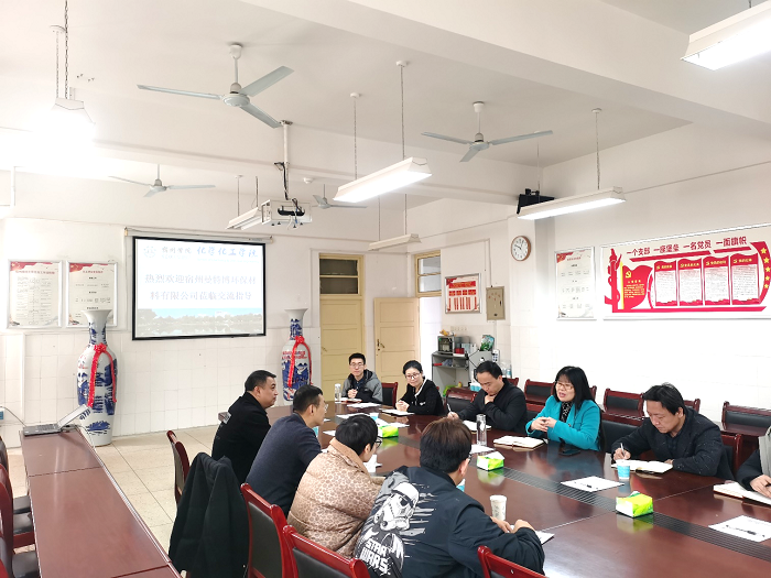 11月23日上午宿州曼特博环保材料有限公司董事长龚伟、总经理付小梅带队到化学化工学院开展校企合作交流,化学化工学院党委副书记、院长卓馨,化学化工学院党委副书记(临时负责)史洪伟、副院长张克营及部分博士教师参加交流研讨会。