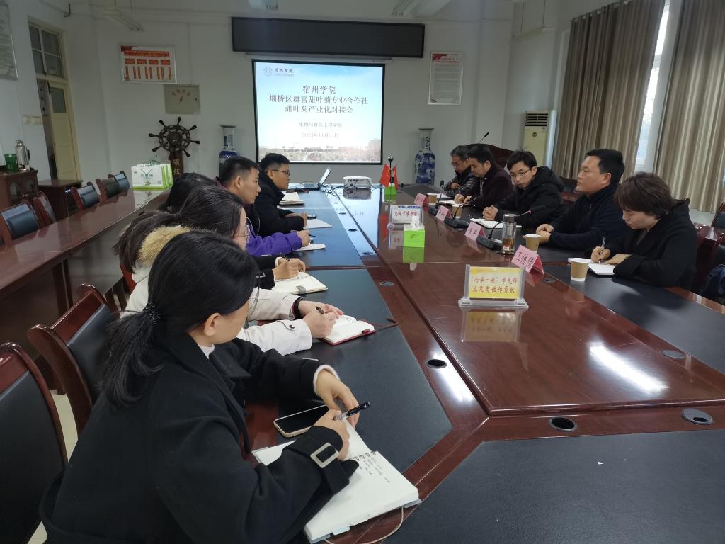 11月24日下午,宿州市埇桥区群富甜叶菊专业合作社董事长陈军、总经理王倩倩一行来到生工学院开展甜叶菊产业化对接洽谈,生工学院党委副书记、院长张兴桃,副院长王海潮,副院长翟科峰及部分博士教师参加了此次对接会。