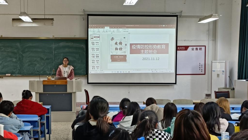 12日,21文化产业管理和21新闻学班开展“疫情防控形势教育”主题班会,此次班会内容主要以ppt形式展现,辅导员李雪玲向全体同学介绍目前全国疫情形势并重点介绍疫情形势紧张地区情况,提醒同学们近期严禁前往疫情中高风险地区城市,全时段禁止学生擅自离校,确需有事离校务必请假。