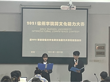 为了“讲好中国故事,传播好中国声音”,锻炼大学生的语言能力,11月24日下午,我校在逸夫楼一楼会议室成功举办了2021年安徽省大学生跨文化能力大赛校内选拔赛。此次选拔赛面向我校全日制本科在读学生,并分为日语组和英语组,共24支参赛队伍,由外国语学院谢冰老师、外教Michael老师以及宿州学院首届跨文化能力大赛冠军组成员、17英语专业同学张肖林担任评委。