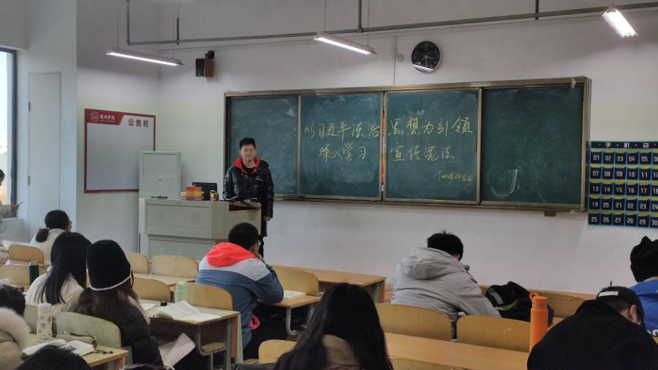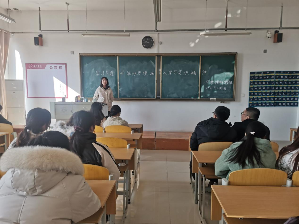 各班辅导员、班主任紧紧围绕“以习近平法治思想为引领 深入学习宣传宪法”主题开展活动。通过线上线下相结合的方式向青年学子重点宣讲了习近平新时代中国特色社会主义思想特别是习近平法治思想;党的十九届六中全会精神;中国共产党成立以来,特别是党的十八大以来党领导人民进行法治建设取得的辉煌成就;社会主义核心价值观;宪法、民法典、教育法和疫情防控等相关法律法规。主题班会上,同学们踊跃走上讲台阐述自己对法治理念与法治思想的认识与理解,表达了坚定不移走中国特色社会主义法治道路的决心与毅力,立志把法治意识作为永久追求落实到自我行动中。