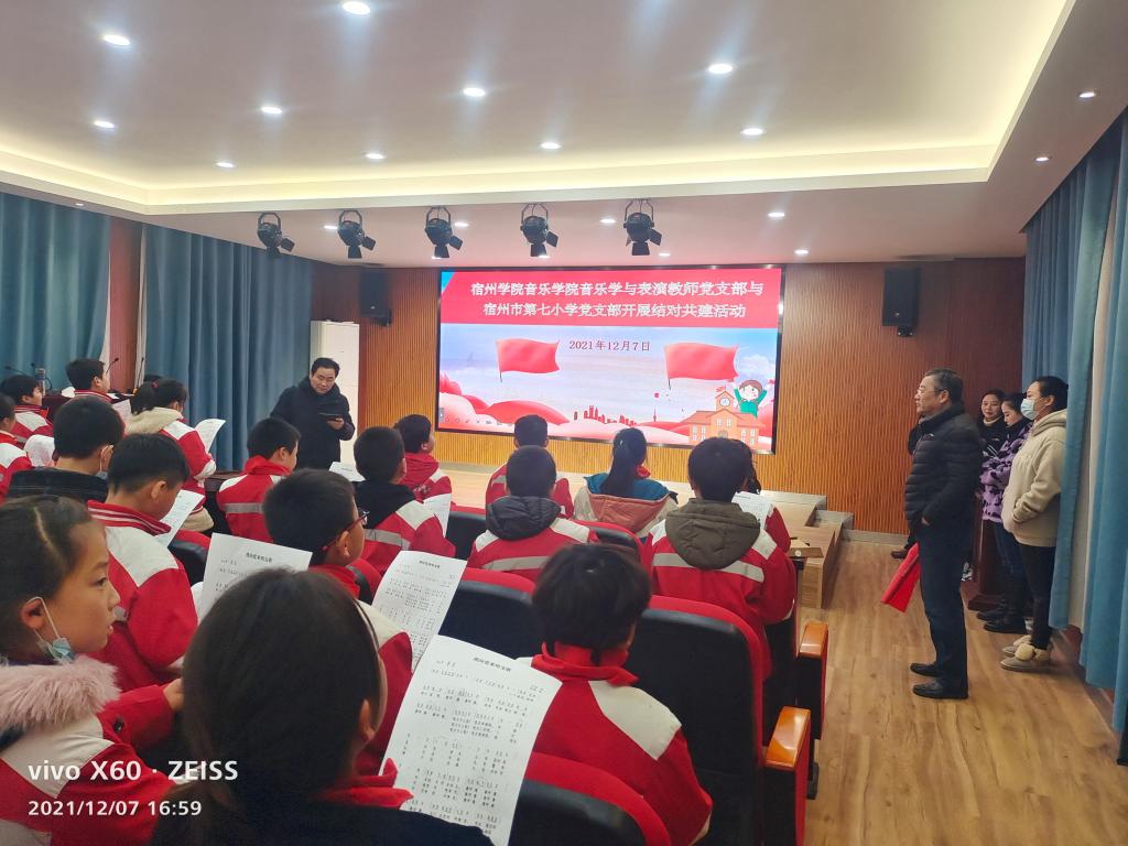 为贯彻落实中共安徽省委组织部关于印发《扎实开展“党旗在基层一线高高飘扬”活动方案》的通知要求,完成学校部署的此项工作,发挥党员先锋模范作用。12月7日音乐学院音乐学与表演教师党支部与宿州市第七小学党支部开展结对共建活动。出席此次活动的有音乐学院党委副书记(临时负责)徐强、音乐学与表演教师党支部书记刘伟、顾大海老师、刘健老师、黄慧老师、李丽娜老师、刘宁老师等新老党员,宿州市第七小学校长,党支部书记杨敬林出席活动。