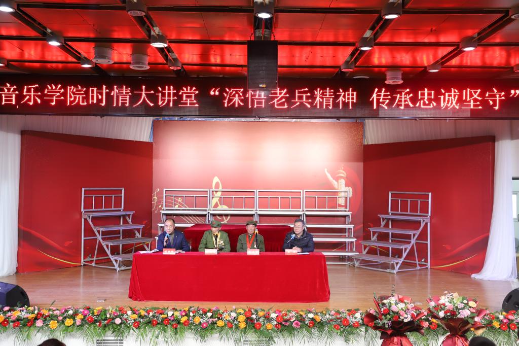 为推进党史学习教育走深走实,12月10月,音乐学院党委在音乐厅举办了以《深悟老兵精神,传承忠诚坚守》为主题的时情大讲堂。此次活动邀请到两位退役老兵李忠秀、郭金友主讲,宿州市退役军人事务局社会宣传员桂振岭出席了本次活动,活动由党委副书记(临时负责)徐强主持。