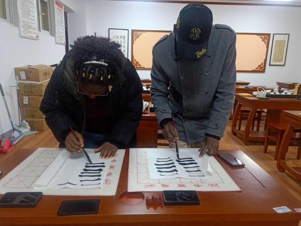 课程间隙,来自加纳的李安,激动地谈到,“我特别喜欢中国的书法作品,我也收藏了很多的书法作品呢!今天能够跟着张老师学习书法,感觉太棒了,我觉得这一次不够,应该每个月都来练一次的!”他的妻子媞娜,也向我们分享了她与丈夫初来中国,在两年左右时间里通过不断看剧和口语练习等途径自学汉语口语的经历,并且向我们强调了“坚持和不放弃”的重要性。张良斌老师特别书写了“前程似锦”和“萬事如意”两份作品送给李安夫妇,以表祝愿。李安夫妇向张良斌老师表达了深深感谢,他们计划将书法贴在房间里,并且勤加练习书法,练好中国书法。
