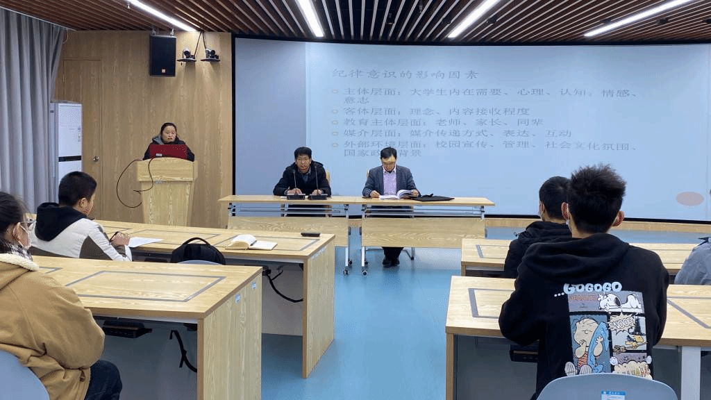 为进一步学习贯彻党的十九届六中全会精神,深化“三全育人”试点工作,加强学生的纪律建设,营造良好的学风考风氛围,12月24日,商学院在实训楼B215报告厅举办了第二期“先行·先进·先锋”大讲堂活动。活动主题为“大学生的纪律意识与纪律遵守”。学院党委书记肖良做开场讲话,辅导员王艳、孙茂顺做工作分享,组织员张锐锐、部分学生党员、学生干部和入党积极分子参加了本次活动。活动由组织员黄凯主持。