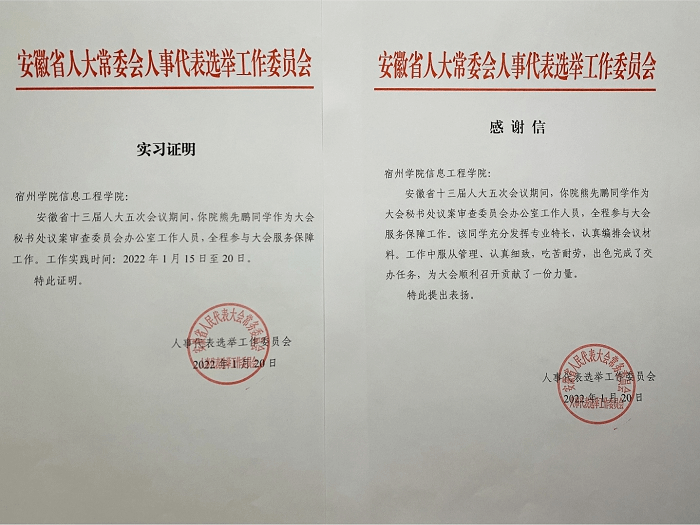 聚焦服务,积极投入。2022年1月17日-1月20日,安徽省第十三届人民代表大会第五次会议在合肥胜利召开,我院19软件工程(对口)班,熊先鹏同学作为大会秘书处议案审查委员会办公室工作人员,参与了本次大会的服务保障工作。会议期间,熊先鹏始终牢记自己身为宿州学院学生,以高度的责任感、饱满的工作热情、认真的工作态度、充分发挥专业特长、积极配合领导工作,为大会的顺利召开贡献了一份力量。