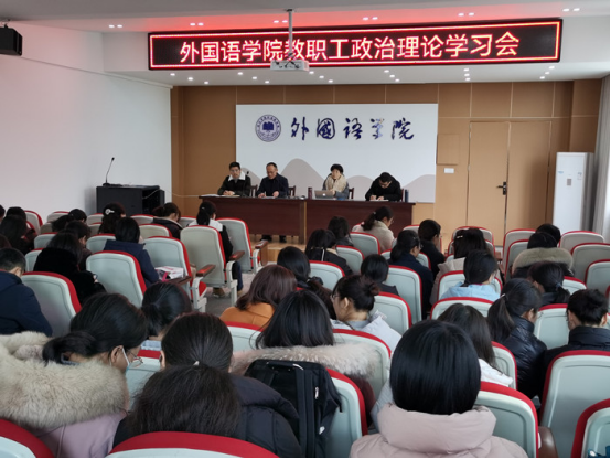 2月23日下午,外国语学院召开全体教职工政治理论学习会,院长张雁凌、副书记张亚锋、副院长胡永近以及全体教师参会。会议由外国语学院党委副书记(临时负责)郝景东主持。