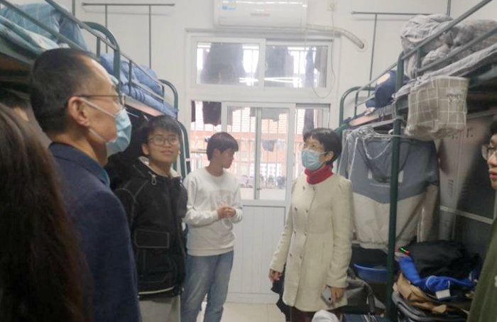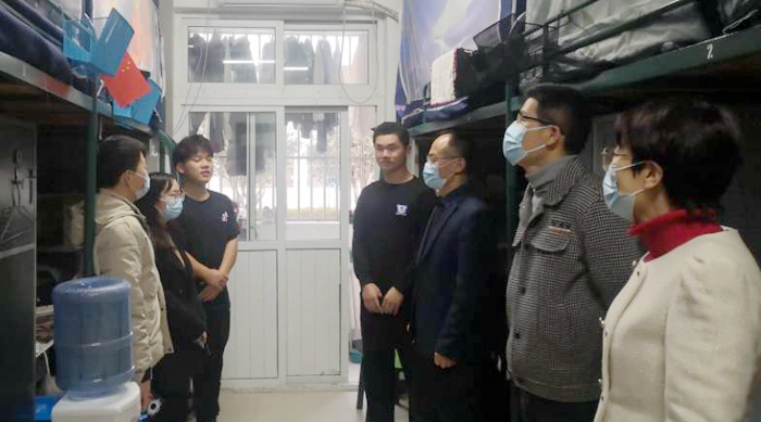 为落实“立德树人”根本任务,推进“三全育人”综合改革试点工作走深走实,在“大党建、大学工、大思政”指导思想下,3月10日下午,外国语学院党委副书记(临时负责)郝景东、院长张雁凌、党委副书记张亚锋带领辅导员工作团队深入走访学生宿舍与同学们深入交流,对同学们关心的问题进行了答疑解惑。