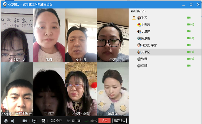 3月13日上午,化学化工学院通过QQ召开辅导员疫情防控线上工作会议。学院党委副书记史洪伟(临时负责)、院长卓馨、副书记刘茜和全体职辅导员参加会议。