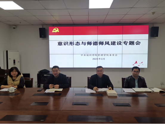 为进一步加强师德师风建设,强化意识形态工作责任制,3月16日下午,管理学院在实训楼C301召开专题会议。党委书记蔡若愚、院长韩传龙、院党委副书记张增林、副院长宋徽和全体教师参加会议。会议由蔡若愚主持。