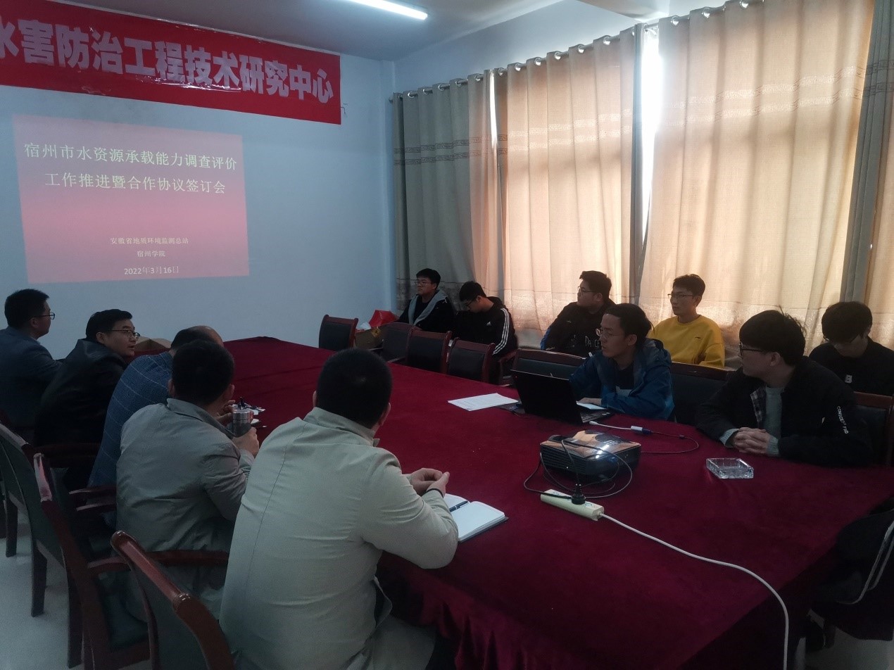 3月16日上午,宿州学院与安徽省地质环境监测总站共同承担的《宿州市水资源承载能力调查评价》(2022-g-1-2)项目推进暨合作协议签订会在国家煤矿水害防治工程技术中心举行。资源与土木工程学院院长陈松、副院长冯松宝、副院长王明梁、中心秘书彭位华,安徽省地质环境监测总站柴龙飞、刘建奎应邀参加。会议由项目负责人刘向红副教授主持。