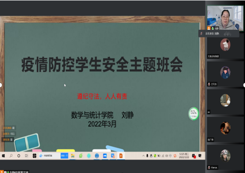 近期,国内多地出现新冠肺炎本土确诊病例和无症状感染者,疫情防控形势严峻复杂。为贯彻落实学校疫情防控工作会议精神,从严从实做好学院疫情防控工作,筑牢广大学生疫情防控思想防线,3月22日,数学与统计学院组织召开疫情防控安全教育主题班会。主题班会通过线上线下相结合方式由各班辅导员主持召开。
