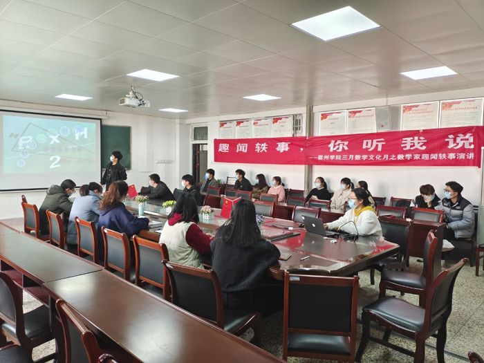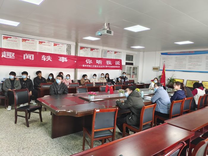 为营造校园数学文化氛围,在全校掀起了解数学文化,热爱数学的热潮,宿州学院于3月23日下午15:00在数学与统计学院会议室举办“三月数学文化月”之数学家趣闻轶事演讲活动。本次活动的评委有数学与统计学院副书记徐依俭、数学与统计学院分团委书记刘静、数学专业教师陈鼎。