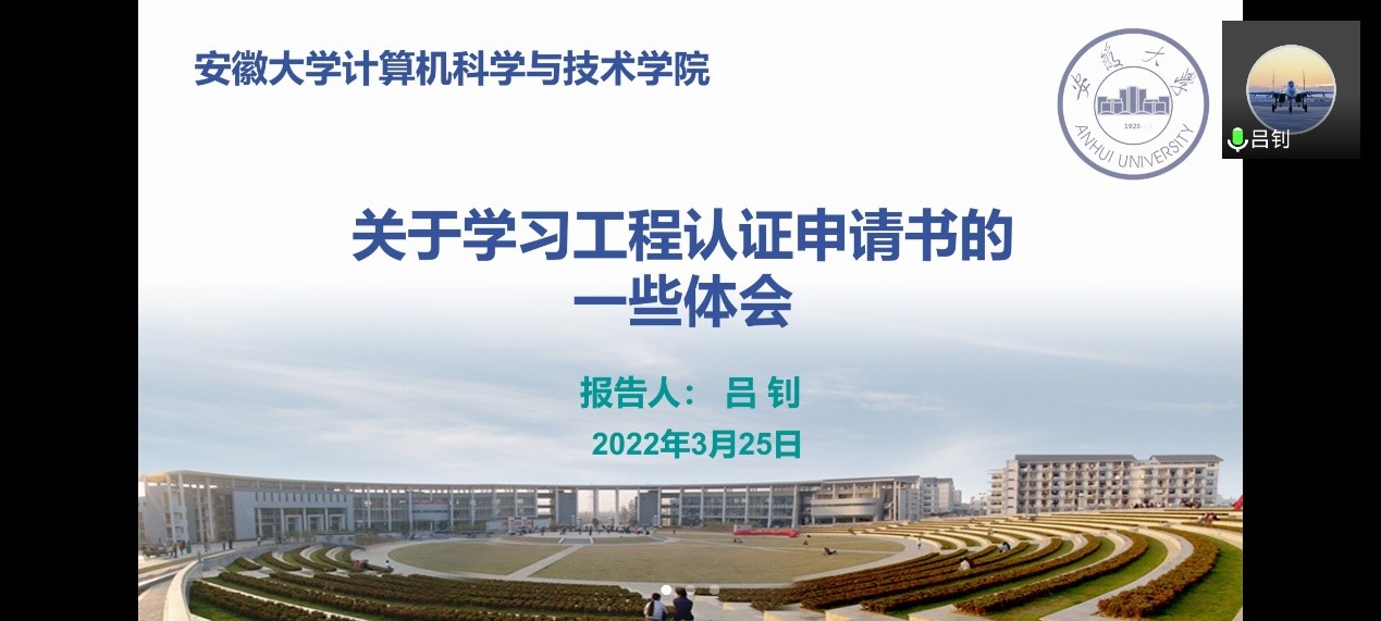 为进一步做好工程教育专业认证工作,提升本科教育教学质量。3月25日下午,信息工程学院在工B315会议室召开工程教育专业认证培训线上报告会。安徽大学计算机科学与技术学院副院长吕钊教授、计算机科学与技术系主任王华彬副教授受邀出席线上报告会。信息工程学院党委副书记吴孝银、副院长崔琳、各专业负责人和骨干教师参加了本次会议。报告会由信息工程学院教学副院长潘正高主持。