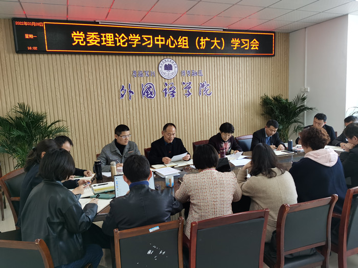 3月28日下午,外国语学院在逸夫楼A318会议室召开了党委理论学习中心组(扩大)学习会,学院党委委员、科级以上干部及教研室主任参加,会议由党委书副书记(临时负责)郝景东主持。