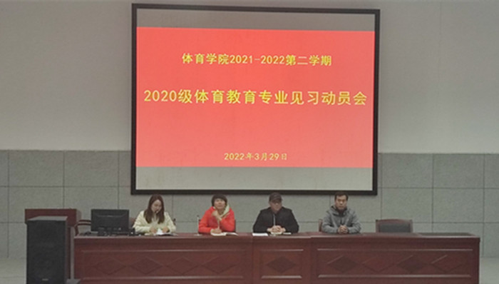为进一步做好专业教学实践工作,推进我院见习工作的顺利开展,体育学院于3月29日下午在体育馆多功能报告厅开展2020级体育教育专业见习动员大会。体育学院院长白明、党委副书记王德玉、副院长陈芳芳实习指导老师和见习生参加了本次动员大会。会议由实习实训中心主任张丽萍主持。