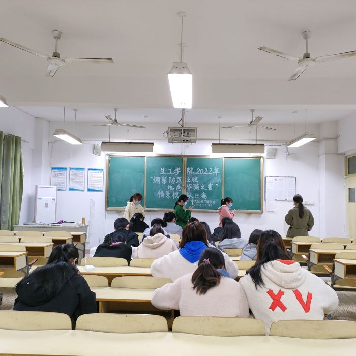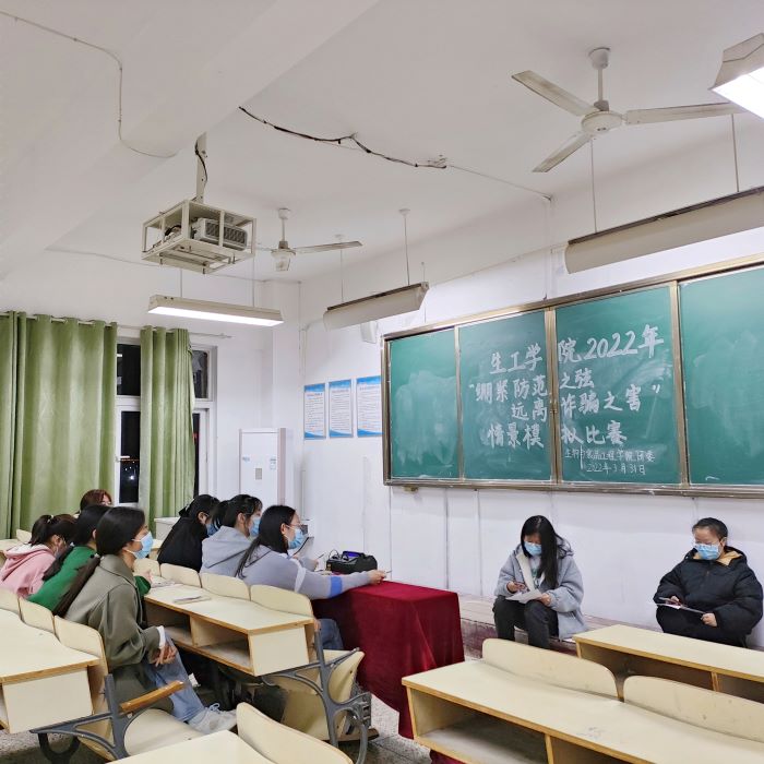 为了提高当代大学生防诈骗意识,加强对诈骗集团诈骗手段的认识,增强自我保护意识,生工学院于3月31日晚在教学楼A518举办了2022年“绷紧防范之弦,远离诈骗之害”情景模拟比赛。