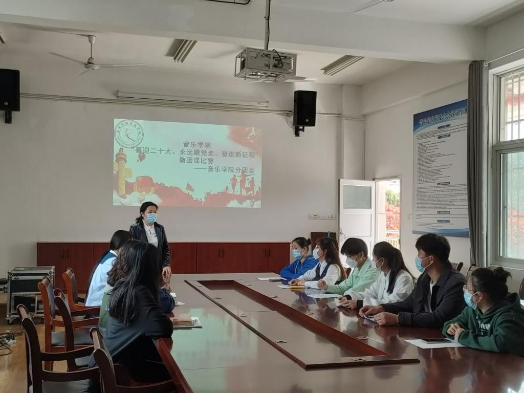 为迎接和学习宣传贯彻党的二十大,庆祝中国共青团成立100周年,团结引领音乐学院团员青年坚定跟党走、建功新时代。4月6日,音乐学院在会议室举办“喜迎二十大、永远跟党走、奋进新征程”微团课比赛,比赛由音乐学院分团委主办,音乐学院党委副书记、纪委书记李小娜以及各辅导员担任比赛评委。