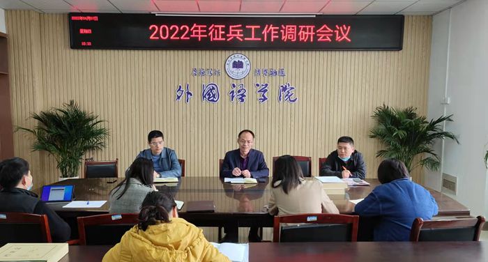 为做好2022年大学生征兵工作,4月7日上午,学生工作部副部长贾学彬来到外国语学院对外院征兵工作进行调研,调研会在逸夫楼318会议室召开。学校党委副书记(临时负责)郝景东、副书记张亚锋和学生工作团队成员参加会议。