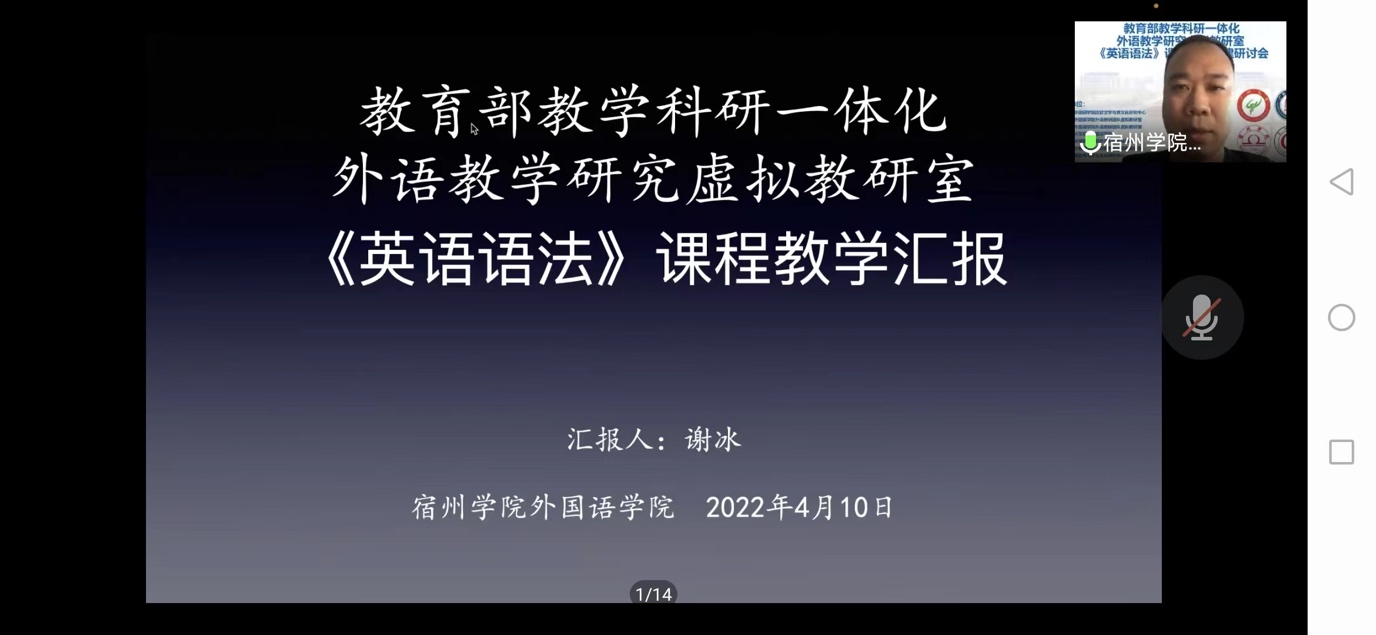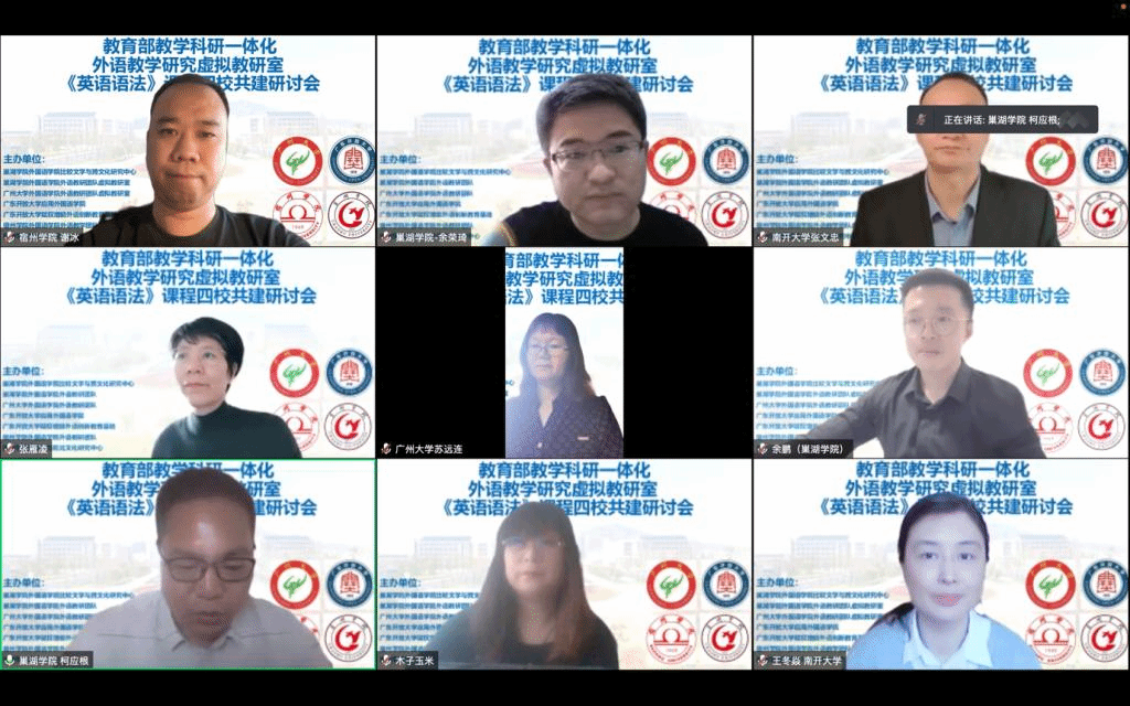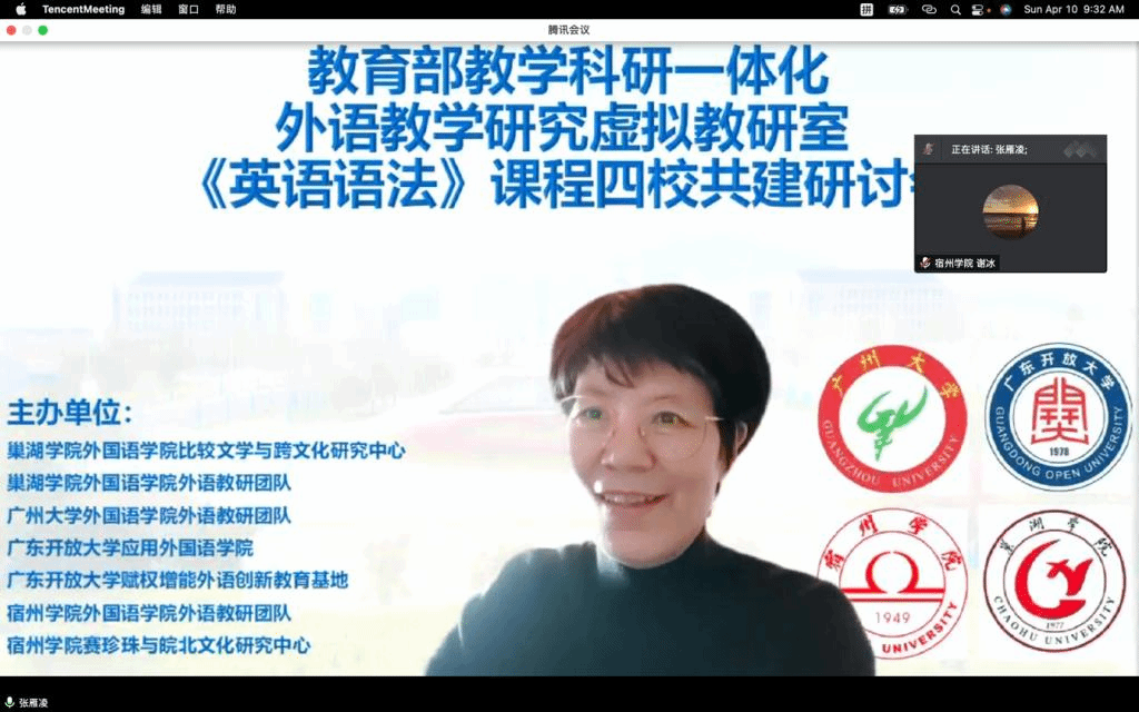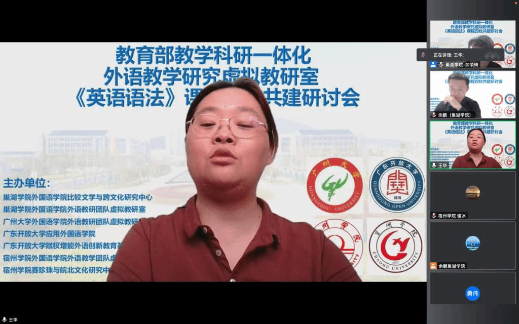 4月10日,由巢湖学院、广州大学、广东开放大学和宿州学院共同主办的“教育部教学科研一体化外语教学研究虚拟教研室《英语语法》课程四校共建研讨会”在云端举行。