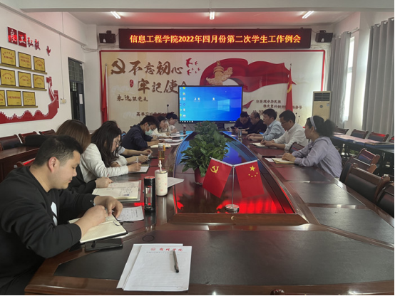 4月11日下午,信息工程学院在工B315会议室召开四月份第二次学生工作例会。会议由信息工程学院党委副书记(临时负责)余晓永主持,信息工程学院党委副书记、纪委书记吴孝银,信息工程学院组织员(副处级)黄永刚,信息工程学院副院长(教学)潘正高和全体辅导员(班主任)参加了会议。