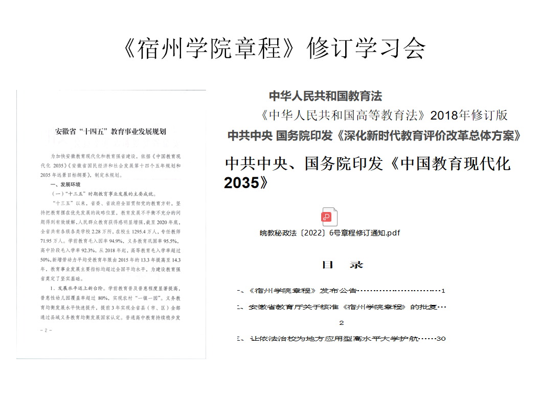 张雁凌首先指出,章程是学校依法自主办学、实施管理和履行公共职能的基本准则。《宿州学院章程》自2015年经省教育厅核准以来,在学校改革与事业发展中发挥了重要作用。为深入贯彻落实习近平总书记关于高等教育的系列重要讲话精神、进一步推进高校依法治校、依法办学,根据《教育部办公厅关于启动新一轮高等学校章程修订工作的通知》要求。我校也将启动新一轮公办高校章程修订工作。