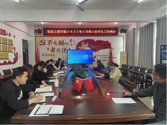 4月18日下午,信息工程学院在工B315会议室召开4月份第三次学生工作例会。会议由信息工程学院党委副书记、纪委书记吴孝银主持,信息工程学院组织员(副处级)黄永刚和全体辅导员(班主任)参加了会议。