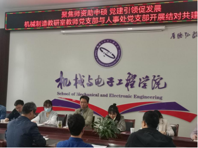 4月20日,机电学院机械制造教研室教师党支部与人事处党支部在工科楼C302组织开展结对共建活动,活动以“聚焦师资助申硕,党建引领促发展”为主题。人事处副处长赵丹,机电学院党委书记杨杰、院长朱光、副书记房爱东、副院长刘从虎,双方党员代表参会。