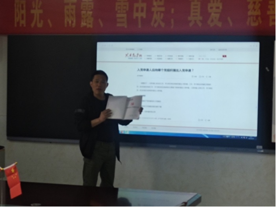 会上,李高利用共产党员网资源结合宿州学院发展党员工作制度汇编,系统讲解了申请入党、入党积极分子的确定和培养教育、发展对象的确定和考察、预备党员的接收、预备党员的教育考察和转正共计五个阶段25个程序。