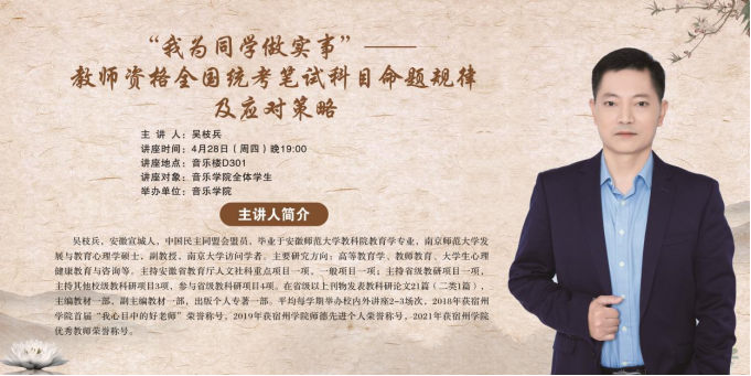 为深入学习贯彻习近平总书记关于青年工作的重要思想,深入开展2022年“我为同学做实事”主题实践活动。4月28日,音乐学院在D301教室举办《教师资格证全国统考笔试科目命题规律及应对策略》主题讲座,讲座邀请到学前教育教研室教育学专任教师、副教授吴枝兵主讲。