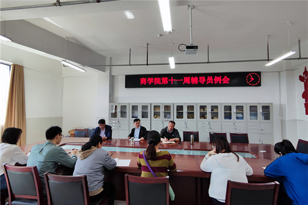 5月2日上午,商学院在实训楼B503会议室召开第十一周辅导员工作例会。商学院党委书记肖良、组织员黄凯和全体辅导员(班主任)参加了会议,党委副书记周亚主持会议。