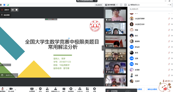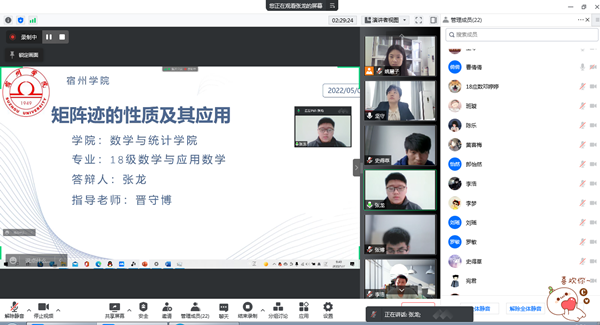 为贯彻落实宿州学院关于新冠肺炎疫情防控工作要求,保证线上答辩顺利开展,数统学院提前部署,制定《数学与统计学院2022届本科毕业论文答辩工作实施方案》,提前进行答辩预演测试视频会议平台及网络情况。