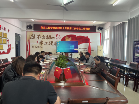 5月16日下午,信息工程学院在工B315会议室召开五月份第二次学生工作例会。会议由信息工程学院党委副书记(临时负责)余晓永主持,信息工程学院党委副书记、纪委书记吴孝银、信息工程学院组织员(副处级)黄永刚和全体辅导员(班主任)参加了会议。
