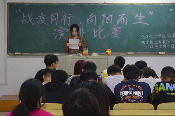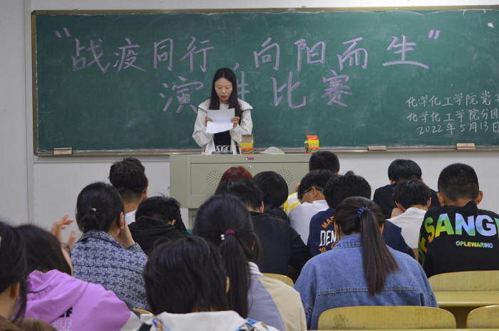 疫情当下,为了增强大学生抗击疫情的责任感和使命感,积极宣传疫情防控知识,宣传疫情下的励志故事。化学化工学院于5月16日在逸夫楼举办以“战役同行,向阳而生”为主题的演讲比赛。