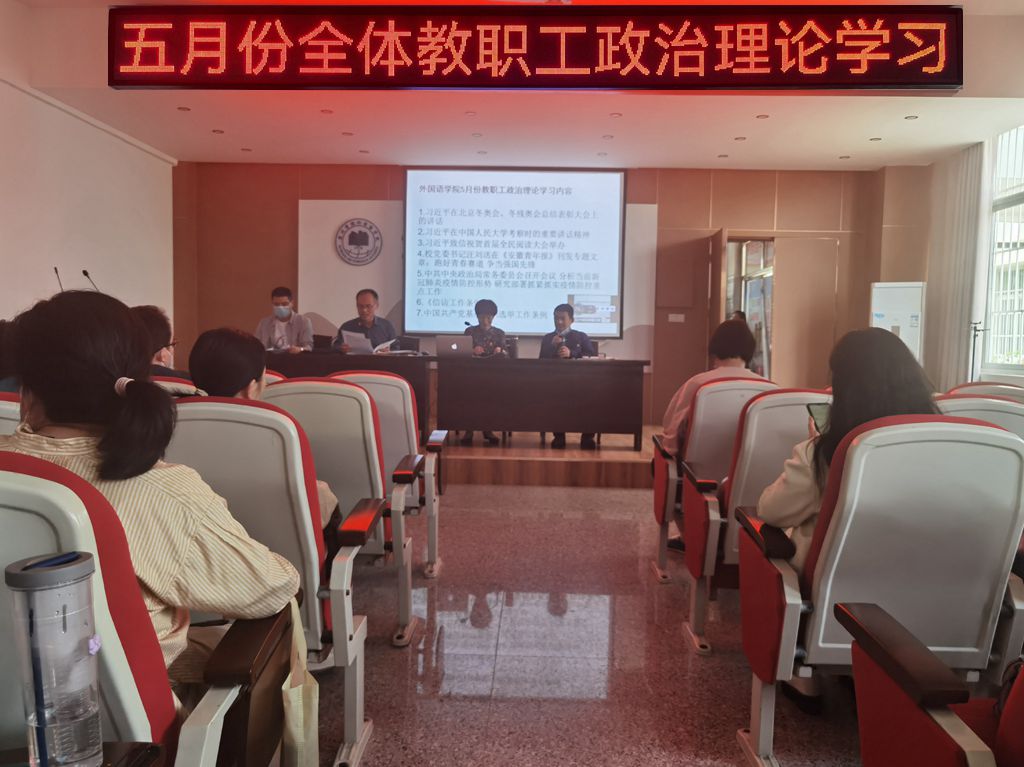 5月18日下午,外国语学院在逸夫楼会议室召开了全体教职工政治理论学习会议,院长张雁凌、副书记张亚锋、副院长胡永近以及全体教师参会。会议由党委副书记(临时负责)郝景东主持。
