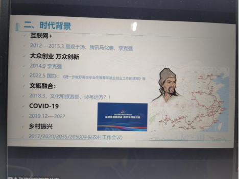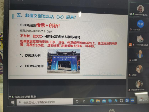 张德欣老师首先讲述了同学们所处的时代大背景,告诉同学们国家鼓励支持双创教育和“互联网+”大赛,是为了用互联网改造传统行业、激发市场、促进就业。在此基础上,讲述了双创项目申报“互联网+”大赛,如搞清楚客户群体、明晰市场定位等等,告诉同学们要具备跨界思维,不要站在旅游的角度看旅游,也不要站在酒店的角度看酒店,要跳出来,站到更综合的维度来看旅游,要结合科技、财经、健康、体育、农业等方面的知识。张德欣老师重点就“非遗文创怎么活起来”进行了讲解,以剪纸和打铁花为例,将理论与实践结合,极大激起了同学们课程学习的兴趣,拓展了同学们的视野,启发了同学们的创新创业意识和思维。
