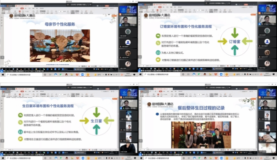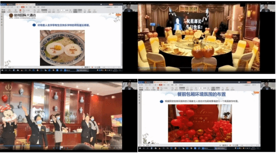 首先,桑经理从宿州国际大酒店实践的角度讲述了包厢主题宴会的服务流程和标准;接着,全面分享、深入剖析和多角度展示了多种包厢主题宴会的设计、管理和接待服务设计,包厢生日宴、订婚宴、节日宴和商务宴以及政务宴。桑经理从目前宴会市场和宿州市宴会市场的现状和趋势,结合宴会设计科技、疫情影响、消费升级转型、宴会文化的传统回归和现代创新等最新的趋势,分别对这四类包厢主题宴会的主题设计、环境设计、氛围的营造、文化礼仪传承、服务设计、营销与接待管理等进行了深入细致的讲解。桑经理的讲解深入浅出娓娓道来、图文并茂、视频帧帧精彩、文化品位高雅、创意情感十足,将理论与实践充分地结合,极大激起了同学们课程行业实践的学习兴趣,拓展了同学们的视野,启发了同学们的创新创业意识和思维。既是对因疫情限制的该课程企业实践和宴会汇报管理与服务校内实践的有效弥补,又是对该课程大量的国宴、峰会宴会、婚宴(礼)等设计、服务与管理视频学习的有益补充。讲座结束后,同学们与桑经理进行了充分的交流和讨论,反馈积极,效果良好,同学们认为这样的授课方式很好,感觉能够了解更多的宴会设计、管理、服务以及经营现状和趋势。