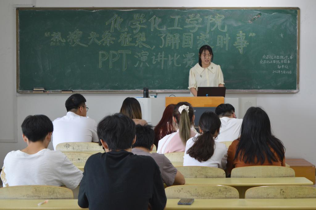 为拓展同学们的知识领域、丰富校园课余生活、紧跟时事、锻炼逻辑思维能力和语言表达能力。化学化工学院于5月29日下午4点在逸夫楼B310举办以“热搜头条征集,了解国家时事”为主题的PPT演讲活动。