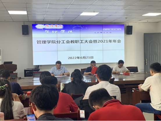6月21日上午9:30,管理学院在实习实训楼C301召开2021年度教职工大会,学院党委书记蔡若愚、党委副书记、院长韩传龙、党委副书记张增林及全体教职工参加会议,大会由张增林主持。