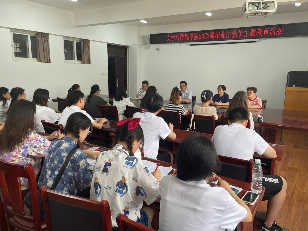 为进一步做好基层党建基础性工作,按照学校组织部门相关要求,6月22日上午,文学与传媒学院在东教A303会议室组织开展2022届毕业生党员主题教育活动,学院党委书记杨文艺,副书记、纪委书记刘影,学生党支部书记吴琼瑶、王龙龙及返校的2022届毕业生党员参加主题教育活动,活动由王龙龙主持。