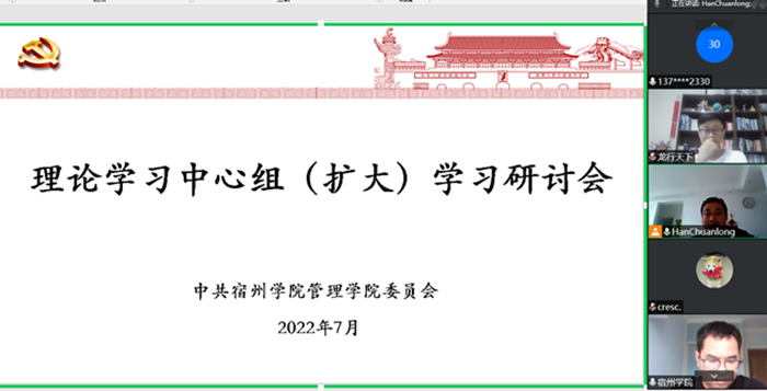 7月23日下午,管理学院利用线上会议平台召开理论学习中心组(扩大)学习研讨会。理论学习中心组成员、科级干部和党支部书记参加会议。会议由院党委副书记、院长韩传龙主持。