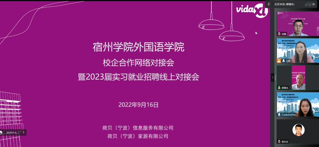 主持人介绍嘉宾后活动开始,郝景东介绍了宿州学院与外国语学院的办学特色与毕业生情况,徐晴展示了荷贝(宁波)信息服务有限公司的发展动态与用人需求;之后,双方通过网络平台开展问答式对接。