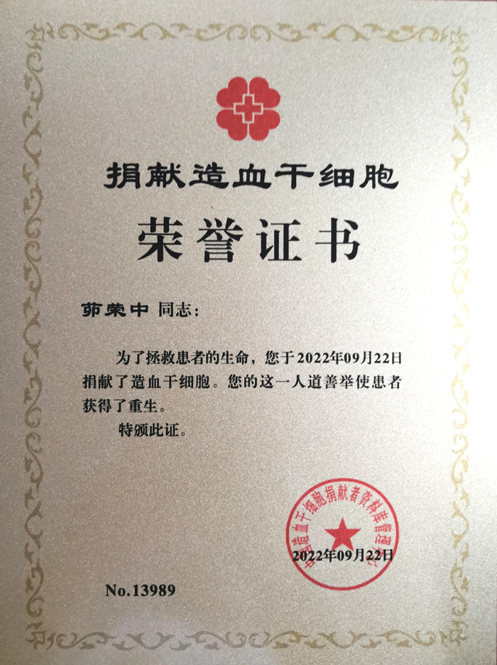 茆荣中说:“希望我的造血干细胞能够帮助患者早日康复,回归正常生活,也希望能够用我自身的实际行动,鼓励身边的朋友加入到造血干细胞捐献者队伍中。”